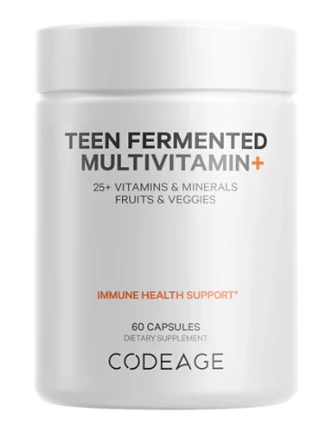A Codeage Teen Fermented Multivitamin+ egy tudományosan összeállított, kifejezetten 12–18 éves fiatalok számára kifejlesztett multivitamin készítmény. Több mint 25 aktív hatóanyaggal, köztük fermentált növényi kivonatokkal, emésztőenzimekkel, probiotikumokkal és vegán D3-vitaminnal segíti a fiatal szervezet optimális működését.