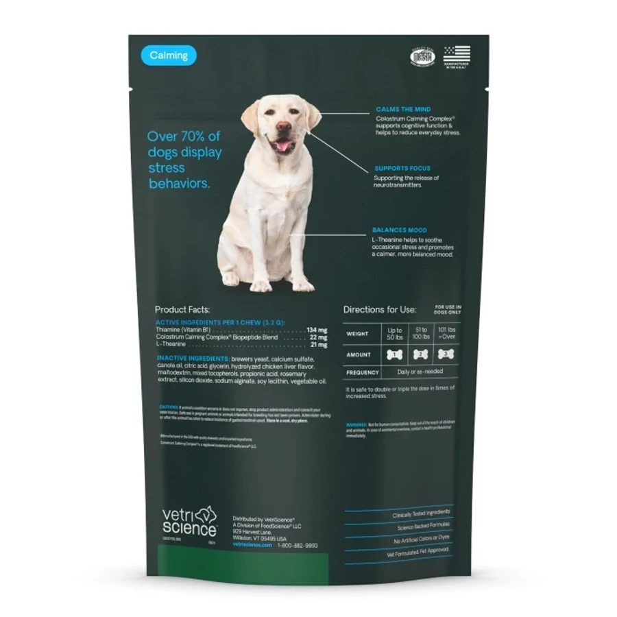 A Colostrum nyugtató komplex BiopeptideBlend támogatja a stresszcsökkentést és a kognitív funkciót; Az L-theanin segít a szervezetnek más aminosavak előállításában, hogy a specifikus neurotranszmittereket egyensúlyba hozza; és a B-vitamin (tiamin) hatással van a központi idegrendszerre, hogy segítsen megnyugtatni az ideges állatokat.