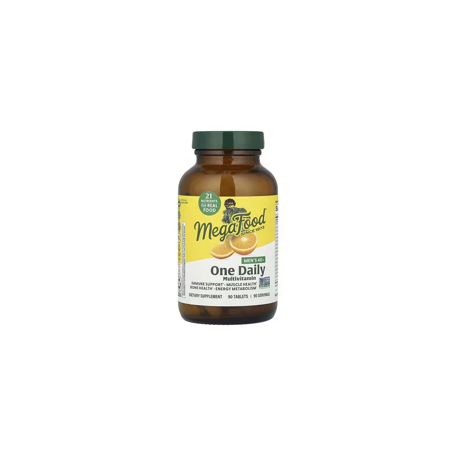 A MegaFood Men's 40+ One Daily egy alapvető multivitamin, amely 21 tápanyagot és valódi élelmiszereket tartalmaz. Kifejezetten a 40 év feletti férfiak táplálkozási igényeinek támogatására lett kifejlesztve. C-vitamint és cinket tartalmaz az immunrendszer támogatására, B-vitaminokat az energia-anyagcsere segítésére, valamint D-vitamint az izom- és csont-egészség fenntartásához.