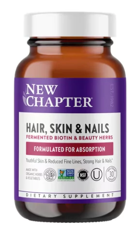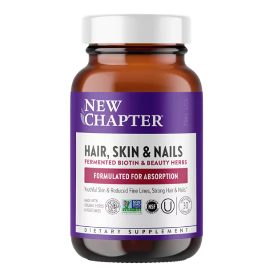 A New Chapter Hair, Skin & Nails kifejezetten a fiatalos bőr, az erős haj és az egészséges körmök támogatására készült, fermentált biotinnal, valamint válogatott organikus gyógynövényekkel és szuperételekkel.