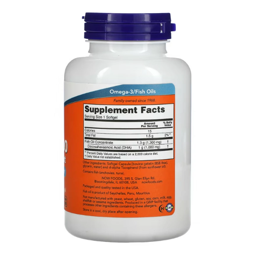 Nagy dózisú DHA-t (1000 mg) tartalmazó, tisztított halolaj-kapszula az agyműködés és a kognitív funkciók támogatására. A NOW Foods DHA‑1000 négyszer annyi DHA-t tartalmaz, mint a normál erősségű változat, és szigorú minőségi ellenőrzés mellett készül – garantáltan higany, PCB és más szennyező anyagoktól mentes.