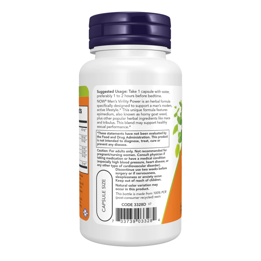 NOW Foods Men’s Virility Power - Férfierő vegán kapszula állati eredetű összetevőket nem tartalmazó vegetáriánus kapszulás formula. Kifejezetten férfiak számára készült, aktív életmódhoz. A készítmény olyan növényi kivonatokat kombinál, mint az epimedium (püspöksüveg), maca és tribulus, amelyek hagyományosan a férfi vitalitás, fizikai erőnlét és nemi egészség támogatásával kapcsolatosak.