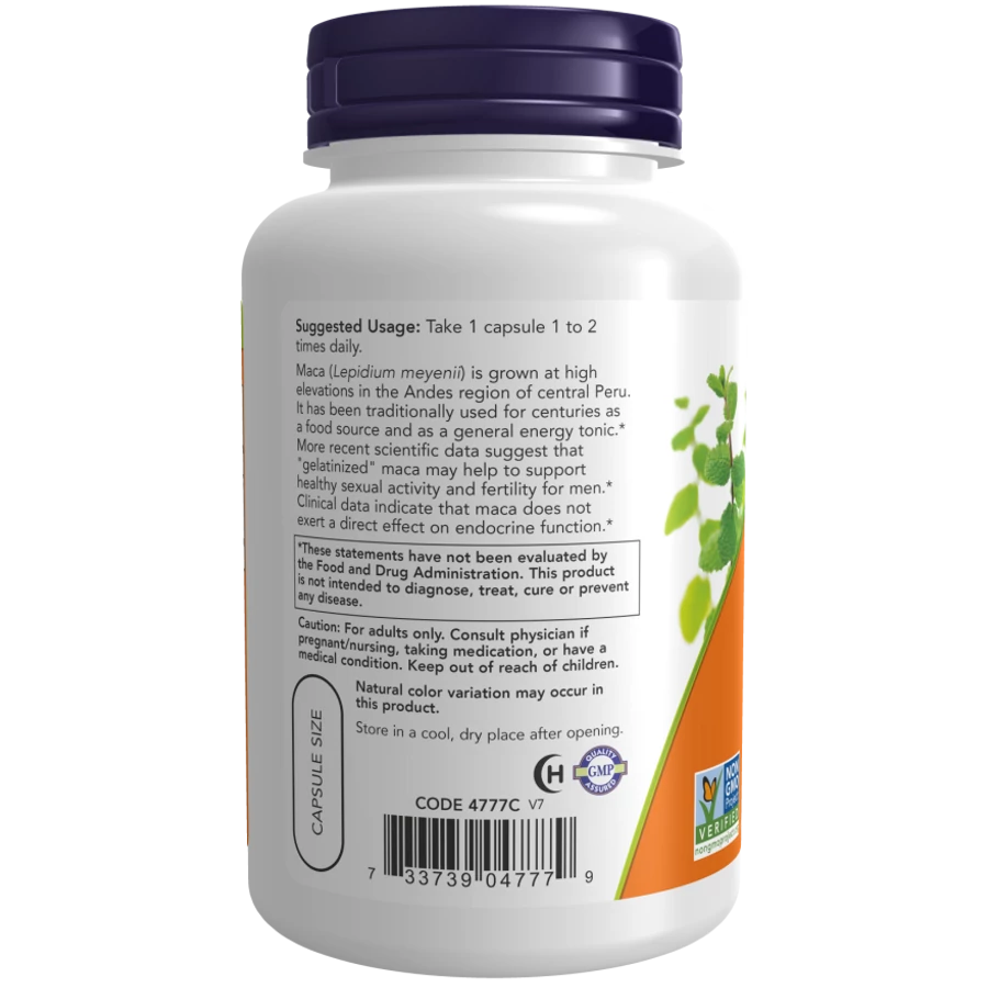 A Raw Maca 750 mg kapszula koncentrált, „gelatinizált” formában előállított, nyers maca (Lepidium meyenii) gyökérkivonatot tartalmaz. A perui Andok magaslati régióiban termesztett maca hagyományosan élelmiszerként és általános energiatonikként használatos. A kapszula vegetáriánus/vegán formában készült, GMO-mentes, glutén-, tej-, illetve tojásmentes formulával, növényi eredetű segédanyagokkal. A gelatinizálás vegetáriánus eljárás, amely eltávolítja a keményítőt a gyökérből, ezáltal koncentráltabb formát eredményez.
