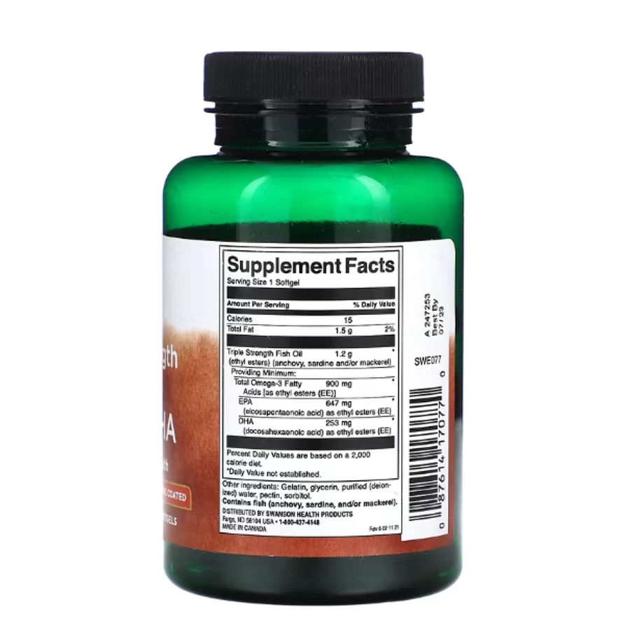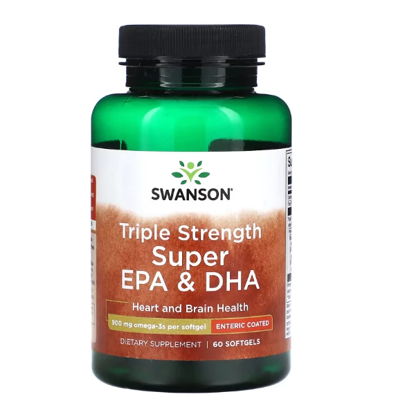 A Swanson Triple Strength Super EPA & DHA egy koncentrált omega-3 halolaj étrend-kiegészítő, amely kapszulánként magas mennyiségben tartalmaz EPA és DHA zsírsavakat. A „triple strength” formula azt jelenti, hogy egyetlen kapszulában jelentős mennyiségű omega-3 található, így hatékony és kényelmes megoldást kínál a mindennapi pótlásra.