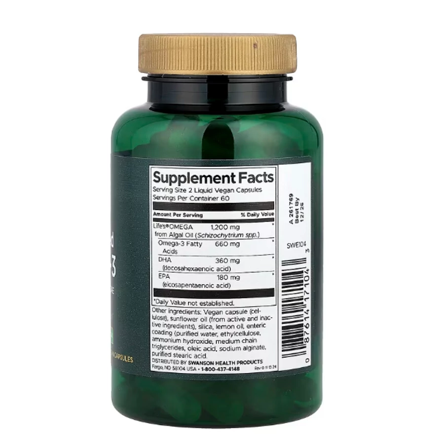 A Swanson Health Products növényi alapú omega-3 készítménye ideális választás azok számára, akik halolaj helyett vegán alternatívát keresnek. A formula tengeri mikroalgából származó omega-3 zsírsavakat tartalmaz, amelyek természetes módon biztosítják a szervezet számára fontos EPA és DHA zsírsavakat.