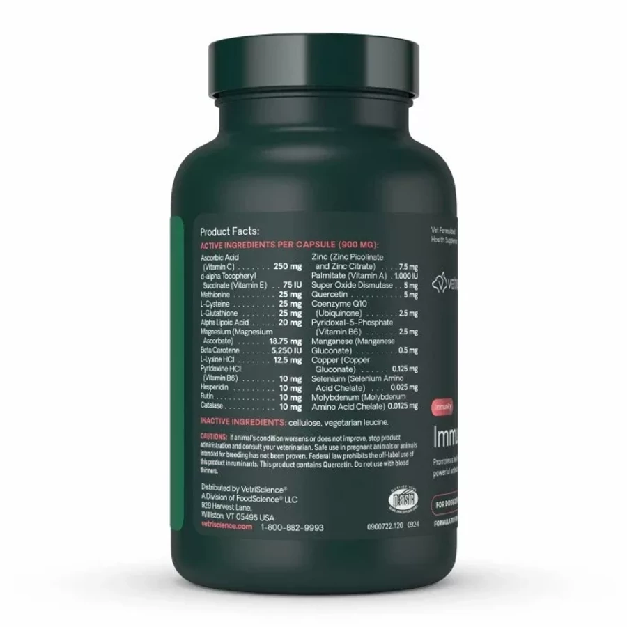 A Vetri Science Immune Plus kapszula 23 erős hatású antioxidánst tartalmaz, melyek a szabad gyökök gátlói. Az A, C, E és B6 vitamin támogatja az immunrendszert és véd a szabad gyökök nemkívánatos károsító hatásától. A B6-vitamint két formában biztosítják: az egyik aktív formában az aminosav-anyagcseréhez, a másik pedig a B6 vitamin hiánnyal rendelkező állatok számára megfelelő.